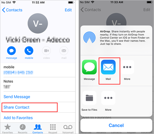 向下滚动屏幕并选择“分享联系人” > “邮件”。
