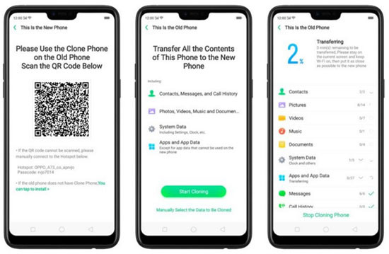 Clone Phone是OPPO公司推出的一款手机克隆工具,可以帮助将数据从安卓/iOS设备转移到OPPO设备。它通常内置在OPPO手机中。你可以通过无线方式完成数据传输。这款应用程序可以让你将联系人、消息、通话记录、照片、视频、音频等文件转移到OPPO手机上。