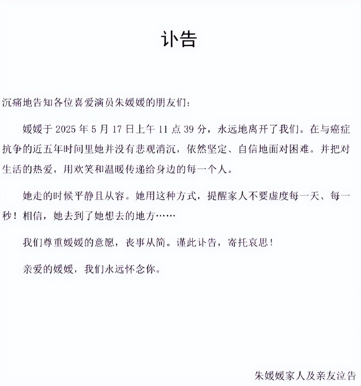 宣告朱媛媛因恶性肿瘤治疗未果离世,终年51岁。