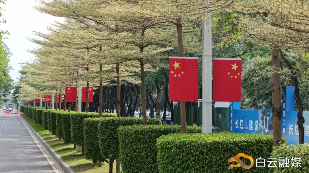 △云城西路、白云大道等道路,一面面国旗迎风招展,在白云景致的映衬下,形成一道道靓丽的“红色风景线”。